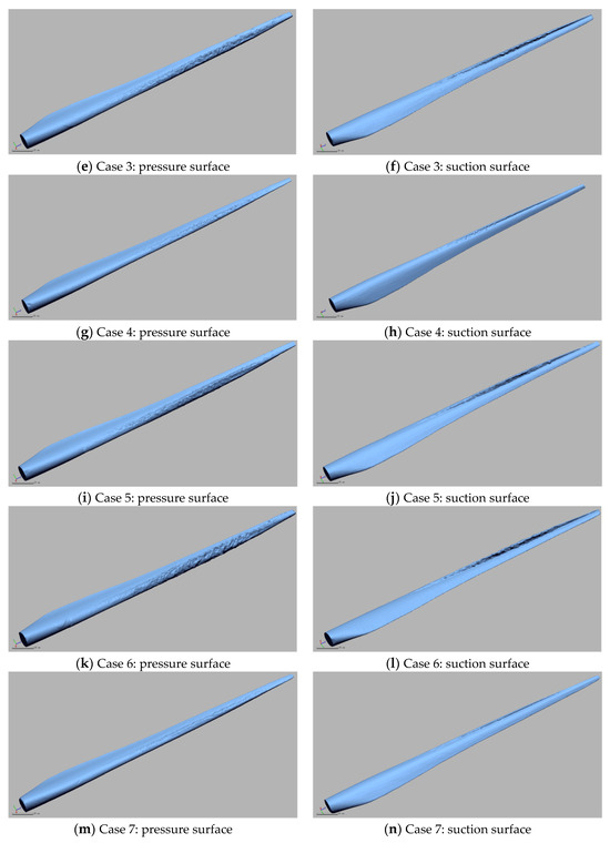 The ice accretion wind tunnel experiments were carried out according to the specified parameters, leading to the formation of fully ice-covered blades. Subsequently, a contrast agent was applied to the ice, followed by 3D scans under nine operational conditions. These scans unveiled the 3D morphology of the ice-covered blades (Figure 8).