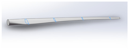 To examine the ice properties on the surfaces of wind turbine blades, the blade was partitioned into different 2D planes utilizing the blade element momentum theory for the analysis of ice characteristics on the blade surface [38]. The airfoil sections of the wind turbine blade were divided at locations 16.3% (6 cm), 41.3% (15.2 cm), 66.3% (24.4 cm), and 91.3% (33.6 cm) from the blade root (Figure 10).