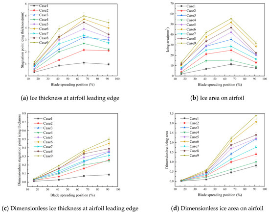 Figure 12 illustrates the ice volume on the blade under various conditions. The influence of the liquid water content (LWC) on the ice volume is analyzed, where the other conditions remain unchanged, namely Cases 1, 2, and 3, Cases 4, 5, and 6, and Cases 7, 8, and 9. For LWC = 0.25 g/m3, 0.45 g/m3, and 0.62 g/m3, the ice volume is increased in all the conditions. The influence of the wind speed on the ice volume is analyzed, where LWC = 0.25 g/m3 and other conditions are kept constant, namely Cases 1, 4, and 7, where the ice volume increases in sequence. The influence of the wind speed on the ice volume is obvious; when the LWC is increased to 0.45 g/m3, namely Cases 2, 5, and 8, the ice volume still increases gradually, but the change is not obvious, and the influence of the wind speed on the ice volume weakens; when the LWC = 0.62 g/m3, namely Cases 3, 6, and 9, the difference in ice volume is small, and the ice volumes of Cases 6 and 9 are almost the same. This indicates that as the LWC increases, the influence of the wind speed on the ice volume gradually decreases.