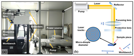 (a) Photo of the laser processing system; (b) Schematic diagram of the processing process.