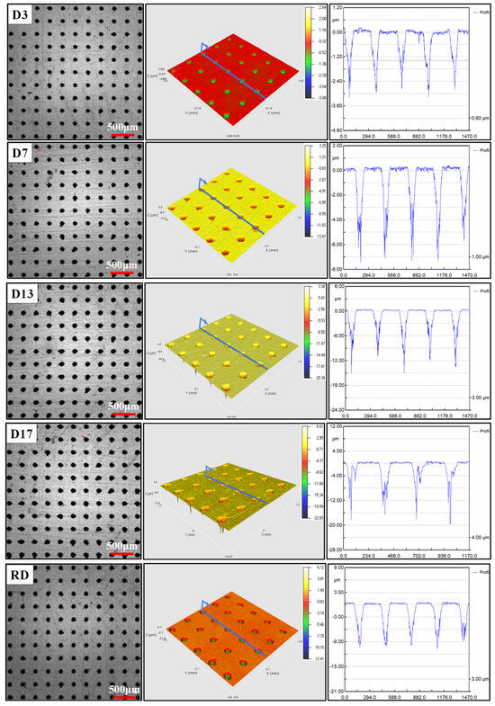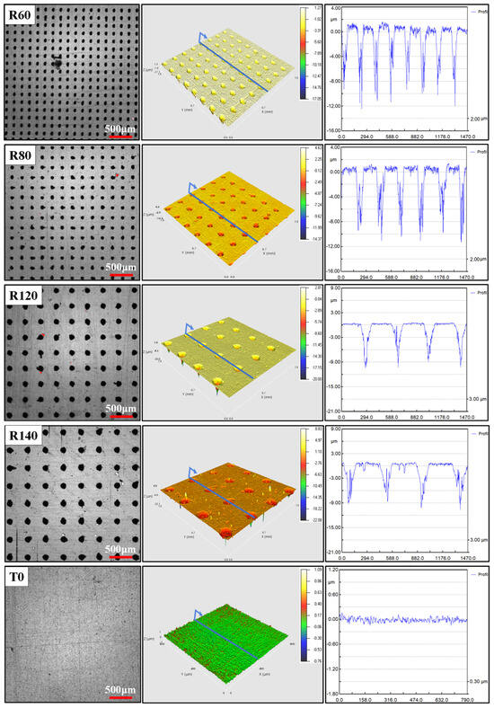 The three-dimensional morphology and local two-dimensional contour maps of each sample after laser processing are shown in Figure 2. In order to fully reflect the cross-sectional morphology and depth of the texture, a section is selected at the center position to obtain the complete two-dimensional contour.