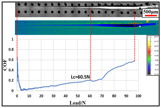 The critical load Lc at which continuous coating delamination begins was determined by combining changes in the coefficient of friction (COF) curve with two-dimensional optical micrographs and depth maps of the scratches. Typical COF curve and scratch morphology images are shown in Figure 5. From the grayscale image of the scratch; it can be observed that the silver-white substrate becomes visible when the coating begins to delaminate continuously at the critical load. It is essential to note in the figure that due to minor elastic deformation of the loading rod caused by significant horizontal force during horizontal movement in the experiment, upon lifting the loading rod after the experiment, accumulated elastic potential energy is released, causing the loading rod to continue sliding along the scratch for a distance, leaving a ‘tail’ at the end of the scratch. The deepest point of the scratch, indicating the actual endpoint of the scratch in the experiment, can be determined from the scratch’s two-dimensional depth map.