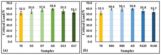 The critical failure loads of each sample’s coatings: (a) Samples with the same diameter but different depths; (b) Samples with the same depth but different diameters.