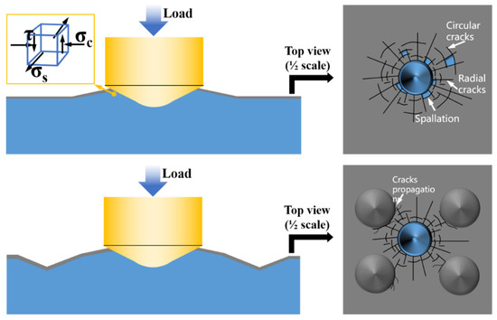 Schematic diagram showing the formation of radial and circumferential cracks and the inhibitory effect of micro-dimple textures on crack propagation.