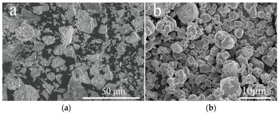 Ground granulated blast furnace slag (GGBS) with irregular sheets and a mean size of approximately 10 μm was provided by Beihai Chengde Steel Company (Beihai, China). The chemical compositions of the slag were CaO, 43.40%; SiO2, 27.28%; Al2O3, 3.22%; MgO, 9.95%; SO3, 1.75%; TiO2, 1.17%; K2O, 0.60%; Na2O, 0.54%; Fe2O3, 0.29%; MnO, 0.13% and 0.01% LOI, which were determined by X-ray fluorescence (XRF). The SEM figure is shown in Figure 1a. Triethoxycaprylylsilane (TTOS) (C14H32O3Si > 97%, AR) was supplied by Macklin Biochemical Technology Co., Ltd. (Shanghai, China). Commercial cuprous oxides with irregular shapes were delivered by Yexindun Alloy Co. LTD (Beijing, China). The SEM figure is shown in Figure 1b. Dry powder water glass (modulus M = 2.8 (SiO2/K2O molar ratio) was produced by the Zhongfa Water Glass Factory (Foshan, China). Q235 steel (Fe > 99%) and glass slides were acquired from Guantai Metallic Materials Co., Ltd. and Fangyuan Technology Co., LTD (Guangdong, China). Quartz sand (200 mesh) was provided by Ming Hai Environmental Protection Company (Shenzhen, China). Phaeophyta tricornutum was purchased from Xingxing Live Bait Company (Foshan, China). Staphylococcus aureus comes from Xinzhong Biological Engineering Co., LTD (Shanghai, China). Deionized water was prepared in the laboratory. All the raw materials were used directly without any further purification.