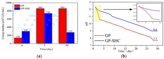 The bacterial numbers of the GP and GP-SHC surfaces are shown in Figure 3a. As predicted, GP samples unveiled a strong antibacterial effect when they were not immersed, and the count of colonies was only 1.4 × 108 CFU/mL. The antibacterial properties of the GP-SHC materials were slightly lower than those of the GP materials without soaking, whose colony count was 3.0 × 108 CFU/mL when the samples were not soaked. Obviously, the most important reason for the high antibacterial property of GP samples before immersion in water is their high alkalinity, thus strongly hindering the growth of bacteria [,]. The GP-SHC samples have a worse antibacterial effect than GP in the initial stage due to the superhydrophobicity preventing water in air entry into GP-SHC materials to avoid leaching alkali metal ions. After the samples were immersed in artificial seawater for 3 days, the antibacterial effects of GP and GP-SHC all dropped vastly, with colony counts of 8.6 × 108 CFU/mL and 7.4 × 108 CFU/mL, respectively, because the GP and GP-SHC samples were merely dependent on surface alkalinity. As shown in Figure 3b, with increasing soaking time, a large number of alkali metal ions in the pores were dissolved, which led to a sharp reduction in the surface alkalinity over time for the first three days of immersion. Then, with the continuous increase in immersion time, the surface alkalinity of GP remained steady, resulting in the antibacterial properties of GPs not varying after 30 days. Overall, the GP showed a strong antibacterial effect in a short period of time. However, it cannot maintain a long-lasting high-efficiency antibacterial effect because water continues to enter the pores and brings out a large number of alkali-soluble ions, which leads to a sharp decrease in alkalinity in a short time. The GP-SHC prolonged its antibacterial life, but its antibacterial performance was still insufficient. Therefore, it is necessary to add cuprous oxide to strengthen the antibacterial properties of AAMs.