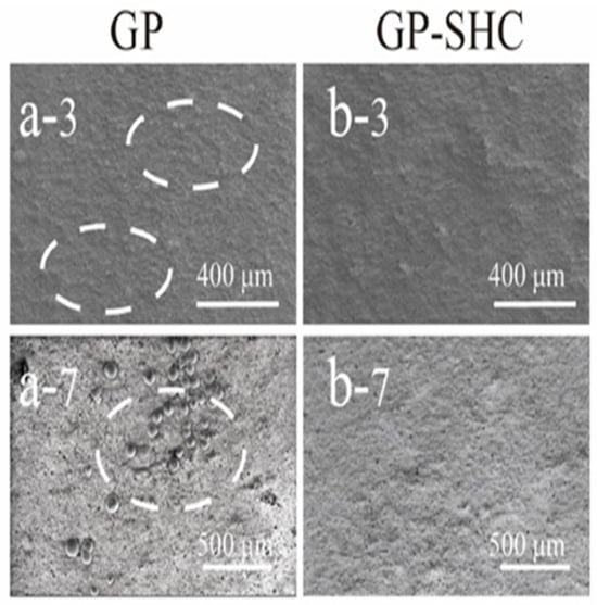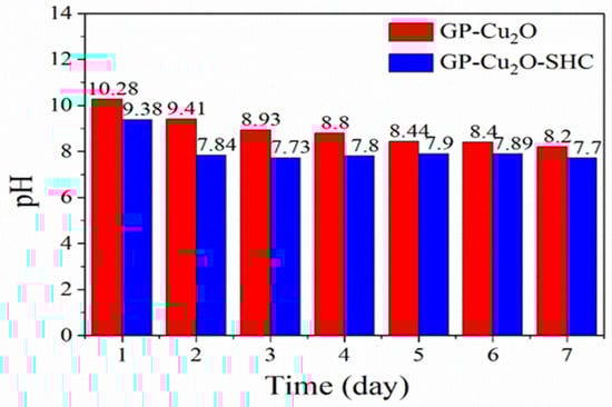 The pH measurement results for the leaching behavior of alkalis in the samples are shown in Figure 11. The pH values of all samples gradually decreased over time. The GP-Cu2O samples exhibited high pH values in the initial stage, with values of 10.28 and 9.41, respectively, after 1 day and 2 days of leaching, which were higher than the standards of high alkaline (pH > 9) antifouling samples []. The GP-Cu2O-SHC samples expressed a low pH value of 7.84 after 2 days of leaching, which was far lower than 9. Notably, it was a transition point of 3d leaching for GP-Cu2O samples whose pH value dropped to 8.93. These results revealed that the GP-Cu2O-SHC samples can slow the ion rate.