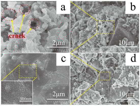 The surface microstructures of the samples were investigated by FE-SEM, as shown in Figure 7. After Cu2O fillers were added (Figure 7a,b) to the AAMs, the fracture surfaces formed irregular swelling structures with sizes ranging from 500 to 1000 nm, and all Cu2O particles were covered with AAM gel layers with some cracks. This obviously indicates that Cu2O may be encapsulated within films as fillers rather than directly reacting with the AAMs. It is well known that surface morphology and chemical composition are the two key factors of fabricated superhydrophobic surfaces. Thus, it may be beneficial to further prepare superhydrophobic surfaces because Cu2O provides a more pronounced rough structure. In contrast, the GP-Cu2O-SHC grew nanostructures and arranged into regular spherical shape structures that led to closely oriented nanostructures, and the gap between the nanostructures was tens of nanometers (Figure 7c,d). Additionally, the width and depth of surface cracks were significantly reduced, and gel structures were closely arranged after hydrophobic modification, which may reduce the porosity. For some small pores, the structure of flower petals, such as lotus stretches, can be grown in the pores to thin the structure of pores after modification.