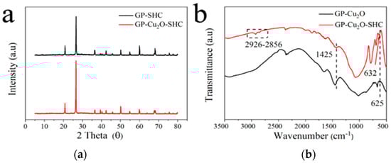 The crystal structure of the sample was analyzed by XRD, as displayed in Figure 8a. XRD investigations demonstrate that Cu2O did not change the crystal structure of GP-SHC because the addition of Cu2O was minimal (only 4 wt.%), and Cu2O was wrapped well by the AAMs gel, so they were not observed in the XRD spectra. FT-IR was used to analyze the chemical composition, as shown in Figure 8b. When cuprous oxide was added, a new peak at 632 cm−1 was observed, which is the standard peak of Cu-O bonds []. In addition, compared with the GP-Cu2O samples, GP-Cu2O-SHC exhibited new peaks at 2926 cm−1 and 2856 cm−1, which are attributed to C-H tensile vibration peaks and are provided by TTOS []. The results demonstrated that methyl groups successfully adhered to the surface of GP-Cu2O-SHC after siloxane modification, which reduced the surface energy. In addition, a new peak at 1425 cm−1 emerged, which was attributed to the stretching vibration of Si-CH2 methylene []. This further confirms that TTOS is related to superhydrophobic forming.