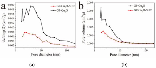 The pore structure of the AAMs plays a key role in the influent process. When water molecules invade, harmful pores provide transport channels for the antifouling material, causing some ions to migrate from within the AAMs to the surface. AAMs are typically composed of two types of pores: pores formed by the interspaces of the aluminosilicate gel phase (<10 nm) and capillary pores, which are formed by the evaporation of water from the original water-filled space (10–100 nm) [,]. The pore size structure of the GP-Cu2O and GP-Cu2O-SHC samples is shown in Figure 9. The GP-Cu2O sample has a wide pore size distribution, ranging from 2 to 100 nm. After modification, the pore size distribution decreased to 2–50 nm, and the number of holes was significantly reduced (Figure 9a). The minimum average pore size of the GP-Cu2O samples was 15.54 nm, while the minimum average pore size of the GP-Cu2O-SHC samples was reduced to 5.57 nm. The BET-specific surface area decreased from 10.02 m2/g to 8.30 m2/g8. These results indicate that TTOS effectively reduces the porosity of the AAM samples and thus controls the entry of water to a certain extent. The reduced porosity may be due to the lotus structure in the modified pores blocking the pores.