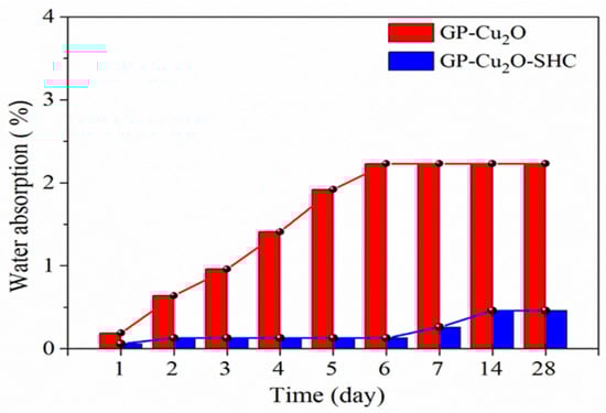 Water absorption is a useful tool for assessing the potential of capillary transport through alkali-activated material pore networks []. As shown in Figure 10, the seven-day water absorption rate of prepared GP-Cu2O approached 2.5%. Even with the addition of cuprous oxide as a filler, the GP-Cu2O samples cannot effectively prevent the rapid entry of water. The water absorption of GP-Cu2O essentially reached saturation on the sixth day. However, after hydrophobic modification, the water absorption rate of the GP-Cu2O-SHC samples was still less than 0.5% in seven days, and it only reached the water absorption saturation point on the fourteenth day. The superhydrophobic surface and the lotus structure inside the pores act as a physical barrier for water transport, which reduces the absorption of water by capillary action and effectively prevents the entry of water.
