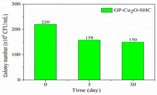 The count of colonies on the GP-Cu2O-SHC is shown in Figure 13. The GP-Cu2O-SHC and GP-SHC samples had a similar effect of controlling the release of soluble ions to decrease the leaching of alkali at the beginning. The count of colonies on GP-Cu2O-SHC was 2.2 × 108 CFU/mL when it was not soaked. Nevertheless, GP-Cu2O-SHC played a more effective role in antibacterial performance than GP-SHC at all times, which was ascribed to the intensified antibacterial effect of Cu2O []. The antibacterial effect of GP-Cu2O-SHC was strengthened, and the colony count was 1.58×108 CFU/mL after the samples were immersed in artificial seawater for 3 days. Here and now, the antibacterial effect of GP-Cu2O-SHC closely relied on Cu2+ rather than alkalinity because Cu2O was gradually leached. The antibacterial effect of GP-Cu2O-SHC was nearly variable, with a colony count of 1.50 × 108 CFU/mL after the samples were immersed in artificial seawater for 30 days. This also proved that the release rates of GP-Cu2O-SHC, copper ions, and alkali metal ions were controllable and steady. In general, the antibacterial activity of GP-Cu2O-SHC samples showed a strong effect and a small fluctuation range. Logically, the GP-Cu2O-SHC samples have long-term antibacterial application potential because Cu2+ can be controllably released.