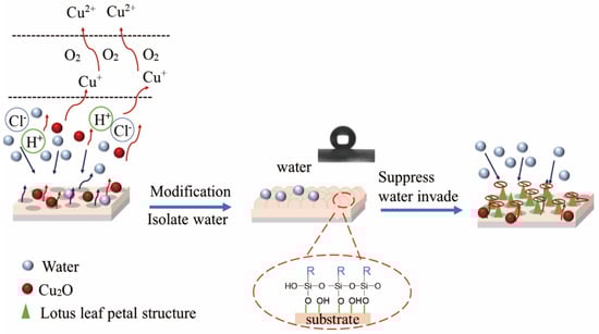 Accordingly, the water inhibition mechanism of the modified structure related to the release of Cu2+ is presented in Figure 14. The release rate of both modified and nonmodified samples decreased to the lowest on the seventh day. Compared with the relevant literature [,,], the release rate of cuprous oxide can be reduced by the alkali-activated material samples themselves and can be further reduced after hydrophobic modification. Therefore, adverse effects on the natural environment can be significantly reduced, and more acceptable release rates that ecosystems can tolerate can be obtained [].