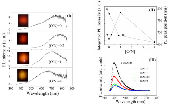 (I) PL spectra of the a-Si/a-SiOxNy:H multilayer samples with different values of [O/N]. (II) The integrated PL intensity and the PL peak positions as a function of [O/N] ratio in the barrier layer (arrows are used to indicate the coordinates corresponding to the data). (III) PL spectra of the a-SiOxNy:H films with different values of [O/N], which were used as the barrier layer in the multilayer structure.