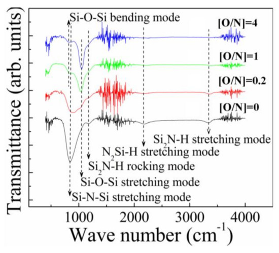 FTIR spectra of the a-Si/a-SiOxNy:H multilayer samples with different values of [O/N].