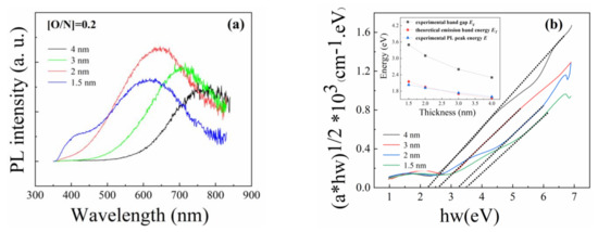 In today’s optoelectronic industry, semiconductor silicon materials occupy a very important position. In order to further develop and achieve the integration of electrical and optical components on a single chip, research on the optoelectronic properties of silicon materials based on mature silicon integration processes is a hot topic. However, for bulk silicon as a luminescent material, due to its indirect transition characteristics in carrier transport, phonon assistance is required during carrier recombination, resulting in low luminescence efficiency [1]. According to the reports, it has been found that by changing the microstructures and dimensions of materials, such as superlattice structures, ultra-thin films, or quantum dots, the luminescence characteristics of silicon materials can be improved, resulting in enhanced luminescence and color-tunable photoluminescence [2,3]. Therefore, due to the superior electrical and optical properties exhibited by low-dimensional silicon materials, they are considered to have significant value in the application of silicon-based optoelectronic devices and have attracted widespread attention. In particular, multilayer structures such as Si/SiO2 [4,5,6,7,8] and Si/SiNx [9,10,11] were introduced to accurately control the size, position, and density of Si nanocrystals. Although several explanations were put forward to explain the photoluminescence (PL) in the low-dimensional silicon materials, like defect states, spatial confinement, and carrier quantum confinement, the origin of PL is still a matter of debate. In recent years, with lots of research on silicon-based thin films [12,13,14,15,16], optical properties such as the refractive index and band gap value of amorphous silicon nitride oxide (a-SiOxNy:H) thin films have been effectively controlled by changing the oxygen/nitride ratio, giving them potential applications in optoelectronic integration fields such as optical fibers and waveguides. Compared to Si/SiO2 and Si/SiNx multilayer materials, the barrier of a-Si/a-SiOxNy:H films is easier to adjust by changing the oxygen/nitride ratio, which is beneficial for studying the effects of carrier space and quantum confinement.