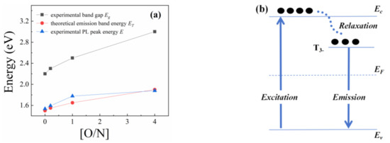In order to further investigate the mechanism of light emission for the a-Si:H/a-SiOxNy:H multilayer films with a 4 nm a-Si:H layer and a 4 nm a-SiOxNy:H layer, the [O/N] ratio dependence of the experimental PL peak energy E, experimental band gap Eg, and theoretical emission band energy ET are given in Figure 6a. It is shown that there is a similar change tendency for Eg and E as the [O/N] ratio increases, which implies that the blue shift of the band gap may be related to the Si-O-Si bonds, as discussed with FTIR. It has been reported that, for a–SiNx:H and a–SiCx:H films [20], the band gap energy will increase as the nitrogen or carbon content increases, and this will lead to a blue shift of Eg. As a result, for a-Si:H/a-SiOxNy:H multilayer films with different kinds of barrier materials, when increasing the oxygen/nitride ratio ([O/N]), the nitrogen and/or oxygen alloying induces structural disorder at the interface, resulting in an increase in the width of the localized states, which leads to an increase in the band gap energy. Meanwhile, it can be seen that the energy of ET is compatible with the PL peak energy E when there is an increase in the oxygen/nitride ratio ([O/N]), which indicates that the origin of the PL of multilayer samples is still related to the T3− level of the silicon dangling bond. Consequently, it can be suggested that, in a-Si:H/a-SiOxNy:H multilayer films, the electrons in the a-Si:H sublayer can be excited by high-energy photons (325 nm) to a highly excited-state energy level and then relax to the T3−level by emitting phonons, before radiatively recombining with holes at the valence band accompanied by light emission, as shown in Figure 6b.