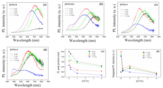 PL spectra of the a-Si/a-SiOxNy:H multilayer samples with different a-Si sublayer thickness. (a) [O/N] = 0. (b) [O/N] = 0.2. (c) [O/N] = 1. (d) [O/N] = 4. (e) The PL peak positions as a function of [O/N] ratio in the barrier layer for samples with different a-Si sublayer thickness. (f) The integrated PL intensity as a function of [O/N] ratio in the barrier layer for samples with different a-Si sublayer thickness.