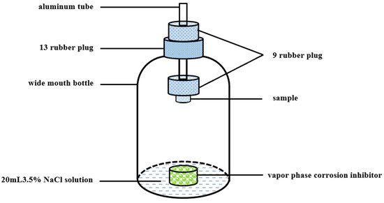 Before the experiment, the surface of the samples was polished step by step using waterproof abrasive paper. First, 800# abrasive paper was used for mechanical grinding. Once the surface scratches were uniform and consistent, a finer grade of abrasive paper was used. The samples were rotated 90° to ensure that the scratches from the previous paper were completely removed. The sequence of abrasive papers used was 800#, 1200#, 1500#, and 2000#. The polished samples were then etched using a 2% nitric acid alcohol solution, followed by cleaning and drying. As shown in Figure 1, 20 mL of 35% glycerol solution was added to a 1 L wide-mouth bottle, and 1 g of a morpholine salt VCI was spread evenly and placed at the bottom. The treated samples were inserted into rubber stoppers, ensuring the experimental surface was within 3 mm of the stopper. The assembly was heated at 30 °C for 66 h, after which ice water was added to the aluminum tube for 3 h. The samples were examined for rust, with a blank control test under the same conditions. The blank experiment had all the experimental conditions identical to those of the experimental group, except for the absence of a corrosion inhibitor.