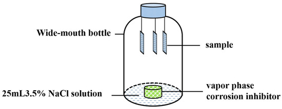 The test specimens were 20# steel coupons, each measuring 50 mm × 10 mm × 3 mm. The surface of the specimens was first polished with 800# sandpaper to achieve a smooth finish. They were then cleaned, dried, and weighed. As shown in Figure 2, 25 mL of 3.5% NaCl solution was added to a 1 L wide-mouth bottle, and a container with a morpholine salt VCI was placed at the bottom. The prepared specimens were suspended in the bottle. The setup was then placed in an oven maintained at 30 °C and heated for 7 days. After the 7-day period, the steel coupons were removed from the bottle. After recording the surface corrosion and the adherence of the corrosion scale, the specimens were immediately rinsed with clean water and dried with filter paper, followed by photography. Subsequently, the recorded specimens were placed in acetone, and surface dirt was removed with degreasing cotton. They were then soaked in anhydrous ethanol for 5 min for further degreasing and dehydration. The specimens were then taken out and placed in a prepared acid cleaning solution for ultrasonic cleaning, The acid washing solution used in the weight loss experiment is a 50% hydrochloric acid aqueous solution with the addition of 0.35 wt.% hexamethylenetetramine. After the corrosion products were removed, any residual acid was rinsed off with tap water, and then the specimens were soaked in anhydrous ethanol for about 5 min, undergoing two cleaning and dehydration cycles. The specimens were then removed, placed on filter paper, dried with cold air, and left to sit for 1 h before the final weight was measured, accurate to 0.1 mg. The corrosion rate is calculated using the following formula:
