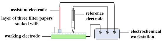 Electrochemical impedance spectroscopy (EIS) tests were conducted on the samples using an electrochemical workstation (CHI660D). As shown in Figure 3, the experiments were carried out with a conventional three-electrode system: 20# steel served as the working electrode, a saturated calomel electrode was used as the reference electrode, and a platinum sheet functioned as the counter electrode. A layer of three filter papers soaked in 3.5% NaCl solution was laid on the working electrode. The auxiliary and reference electrodes were connected on top of the three filter papers to simulate atmospheric corrosion under a thin liquid film. The tests covered a frequency range from 100 kHz to 0.01 Hz, with an amplitude of 10 mV. EIS data fitting was performed using Zsimpwin 3.60 software.