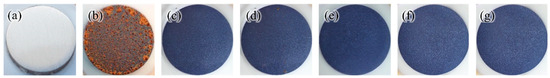 Figure 4 shows the macroscopic photographs of 20# steel surfaces after the VCI capability test. Before the corrosion experiment, the surface of the sample was bright with a metallic luster (Figure 4a). After the corrosion experiment, without the addition of corrosion inhibitors, the surface was covered with reddish-brown rust, indicating severe corrosion (Figure 4b). Under all conditions with added corrosion inhibitors, the surface of the samples appeared blue, which is related to the adsorption and film formation of the inhibitors. Among them, the samples with morpholine formate, morpholine acetate, and morpholine propionate corrosion inhibitors showed slight yellow rust spots on the surface, while the samples with morpholine benzoate and morpholine carbonate corrosion inhibitors showed almost no yellow rust spots, indicating that morpholine benzoate and carbonate have better VCI capabilities.