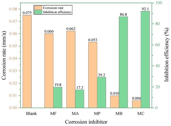 Figure 5 displays the corrosion rates and corrosion inhibition efficiencies of five morpholine salt VCIs in a 3.5% NaCl solution with a concentration of 10 g/L. The corrosion rate of 20# steel without any corrosion inhibitor can reach 0.075 mm/a. With the addition of morpholine formate, morpholine acetate, and morpholine propionate, the corrosion rate slightly decreases, achieving an inhibition efficiency below 30%, indicating the poor performance of these inhibitors. However, after the addition of morpholine benzoate and morpholine carbonate, the corrosion rate rapidly decreases to below 0.01 mm/a, with an inhibition efficiency exceeding 85%, demonstrating the excellent performance of these inhibitors. The corrosion inhibition ranking is as follows: morpholine carbonate > morpholine benzoate > morpholine propionate > morpholine formate > morpholine acetate.