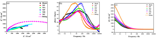 Impedance spectrum of morpholine salt volatile corrosion inhibitors in 3.5% NaCl thin liquid film (a) Nyquist; (b) Phase angle; (c) Impedance modulus.