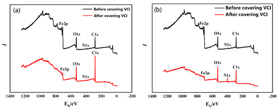 XPS full spectrum of 20# steel samples before and after covering with (a) morpholine benzoate and (b) morpholine carbonate inhibitors.