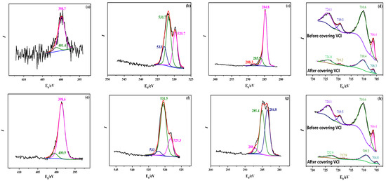 XPS Spectra of 20# steel samples after adding morpholine benzoate VCI at (a) N1s peak; (b) O1s peak; (c) C1s peak; and (d) Fe2p peak; and morpholine carbonate VCI at (e) N1s peak; (f) O1s peak; (g) C1s peak; and (h) Fe2p peak.