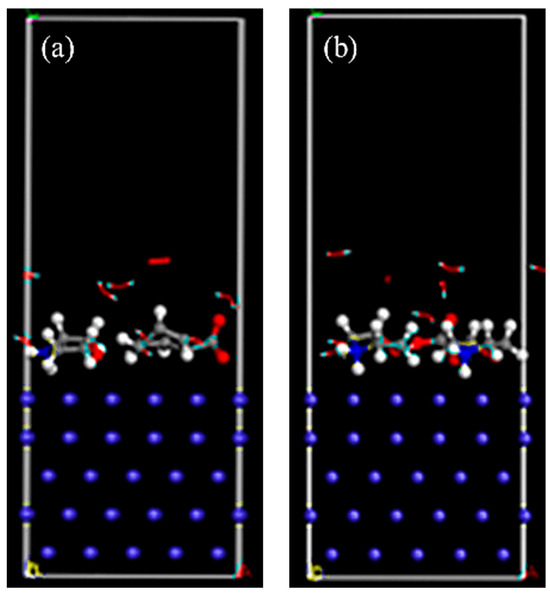 The adsorption states of morpholine benzoate and morpholine carbonate VCIs on metal substrates were simulated using the density functional tight-binding method (DFTB+). The simulations were conducted at a temperature of 40 °C, in an H2O/O2 environment, with an Fe substrate. The adsorption states of the two morpholine salt VCI molecules are shown in Figure 12.