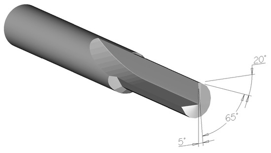 These coatings were applied to 10 mm router bits with one straight edge, manufactured by Vydona (Vydona, Pravčice, Czech Republic). The cutting tools are made from CTS20D, a material known for its excellent properties suitable for machining applications (Table 1 and Figure 1). Below is a detailed overview of its characteristics (Table 2). Tools with a straight edge were chosen to eliminate the effect of forces acting on the Z-axis.