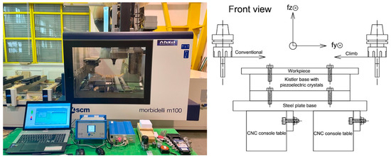 Left: Experimental setup with CNC milling machine; Right: Schematic front view of the milling setup showing the orientations of cutting forces during conventional and climb milling.