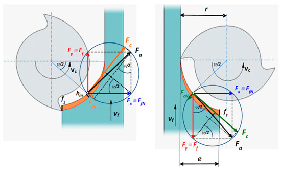 In both climb and conventional milling kinematics, the chip thickness varies [48]. Therefore, calculations must be performed at the midpoint of the angle of engagement (ψ/2), where the average chip thickness (hm) and the average cutting force can be expected.