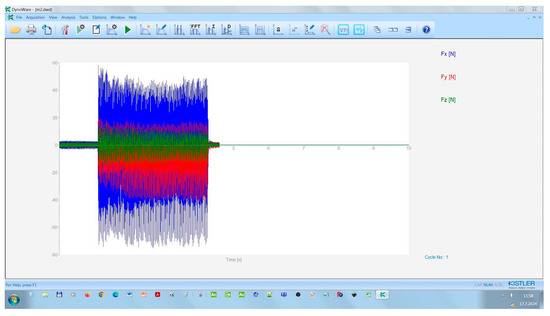 Ten cuts were made with each router bit, for both conventional and climb milling. A selected measurement record of individual components of cutting force is presented in Figure 4. The DynoWare application of the Kistler measuring system allows direct analysis of the measured data in the displayed graph, i.e., it is possible to determine the mean values of the forces Fx (blue progress), Fy (red progress), and Fz (green progress).