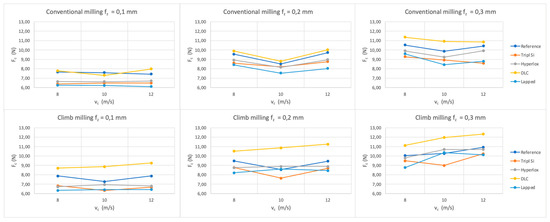 Figure 5 depicts the relationship between the cutting force (Fc) and the feed per tooth (fz) for various tool coatings used in conventional milling and climb milling.