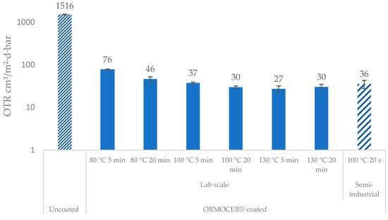 - The OTR value at the semi-industrial coating scale correlated well with the laboratory scale, showed consistency between the two processes, and indicated that ORMOCER® could achieve an optimal level of crosslinking under semi-industrial curing conditions.