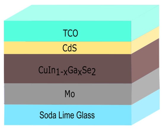 Thin film solar cells are constructed by depositing thin layers of various materials on top of each other. Each layer serves a specific function contributing to the overall goal of efficiently absorbing light and effectively extracting free charge carriers. Figure 4 illustrates the typical structure of a CIGS device. The absorber layer plays a crucial role in a solar cell as it absorbs photons to generate electron–hole pairs. Therefore, the bandgap of this layer should be small enough to match the solar spectrum. If the energy gap (Eg) is high, the material becomes transparent to a wide wavelength range of the solar spectrum, whereas a low Eg layer is susceptible to more lattice vibrations due to the thermalization mechanism. The bandgap of CIGS can be adjusted by varying the Ga content, enabling the tuning of Eg to enhance efficiency [40]. Furthermore, a high absorption coefficient is essential to absorb light efficiently on thin layers. In the case of CIGS, a 2 µm thick layer proves sufficient to create solar cells with high efficiencies, owing to an absorption coefficient on the order of 105 cm−1. CIGS is classified as a p-type semiconductor with a hole density ranging from 5 × 1015 to 1.47 × 1020 cm−3 [42].
