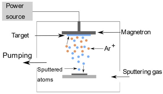 Sputtering is a form of physical vapor deposition (PVD) wherein atoms are ejected from a solid material, known as the target, due to momentum transfer from energetic particles, typically argon (Ar) particles. Figure 7 illustrates a schematic diagram of a sputtering deposition system. Aside from its role in depositing material, sputtering is also employed for cleaning the surfaces of solid materials [64].