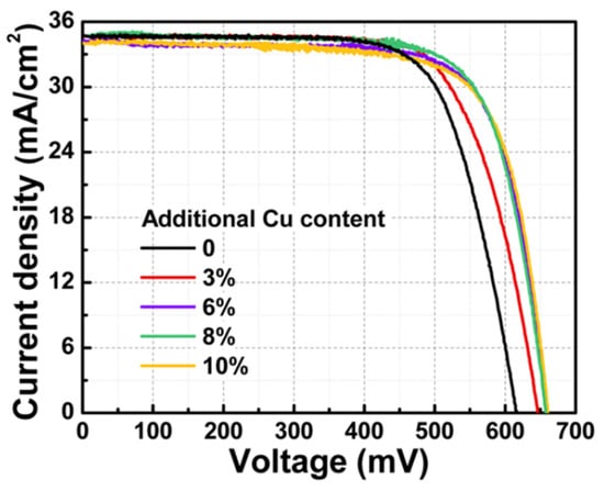 Achieving high crystallinity in CIGS through the three-stage process typically requires elevated temperatures, around 560 °C. Li et al. [79] proposed a modified three-step process with a lower temperature of 470 °C, incorporating an additional Cu-rich phase after the second step, as illustrated in Figure 8. Figure 9 shows the JV curve at different Cu contents. The introduction of an appropriate additional Cu content of 6 at. % improved crystallinity and grain size. It was observed that the preferential orientation of CIGS shifted toward (220)/(204) with the added Cu content, resulting in a 2% increase in efficiency compared to the standard three-stage process [79].