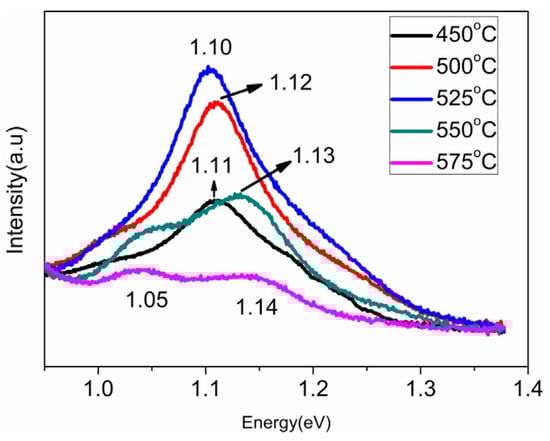 Liang et al. [92] deposited the metal elements in the order of In/Cu/CuGa, utilizing DcMS and pulsed DcMS to sputter In and Cu/CuGa targets, respectively. The selenization step was carried out in the presence of H2Se gas. Suppressing Ga agglomeration near the back contact was achieved by elevating the selenization temperature from 450 °C to 575 °C, resulting in a Voc increase of 0.079 V, as shown in Figure 12, attributed to the blue shift of the band gap. Additionally, enhanced crystallinity and larger grains at higher temperatures, as depicted in Figure 13, increased shunt resistance, ultimately yielding a solar device with an efficiency of 15.09%.