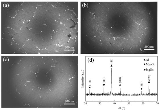 The as-cast microstructure was subjected to EDS scanning, resulting in the generation of Figure 3a and Table 1. They reveal that Ga is uniformly distributed throughout the alloy and also present at the positions occupied by In and Sn. The secondary phase observed at grain boundaries primarily consists of Mg, In, and Sn. While Mg exhibits overall uniform distribution, localized aggregation phenomena are observed, leading to the formation of compounds with other low-melting-point elements (Ga, In, and Sn) [].
