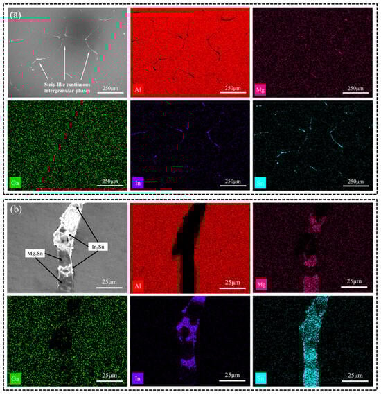 The distribution of the secondary phase in Figure 2a appears disordered. EDS images in Figure 4a exhibit similar patterns for the Mg, Sn, and In elements of the annealed Al-Mg-Ga-In-Sn alloy, transitioning from a block-like or point-like morphology in the as-cast alloy to a strip-like morphology along grain boundaries in the annealed alloy. Figure 4b illustrates an EDS image revealing typical phases present in the annealed alloy; notably, an alternating distribution is observed for the Mg2Sn and In3Sn phases. This suggests that during annealing there was re-melting of low-melting-point phases accompanied by complete diffusion of various atoms.