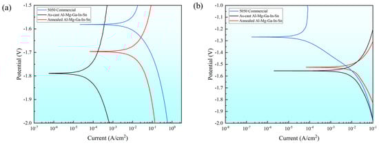 Comparison of corrosion currents: In a 3% KCl solution environment, the corrosion currents of the three samples ranked as follows: the annealed Al-Mg-Ga-In-Sn alloy exhibited the largest corrosion current at 6.80 × 10−5 A·cm2, followed by the as-cast at 2.01 × 10−6 A·cm2, and finally, the least corrosion current was observed in 5050 commercial at 1.77 × 10−7 A·cm2. There exists an order of magnitude difference among these three values. In a 3% NaOH solution environment, it was found that the largest current was obtained for the annealed sample at 6.75 × 10−5 A·cm2, followed by the commercial sample at 2.14 × 10−5 A·cm2, while the as-cast sample showed the lowest value at 5.66 × 10−7 A·cm2. These results indicate that in both solution environments, the annealed condition leads to large corrosion current.