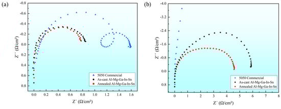 The curve radius of electrochemical impedance spectroscopy represents the interface resistance (Re) between the electrolyte and electrode. A larger radius indicates a higher impedance, implying a slower rate of electrochemical reaction on the material surface. In this study, we investigated the electrochemical impedance spectra in two solution environments: 5050 commercial alloy, and the as-cast and typical annealed state (490 °C, 2.5 h) Al-Mg-Ga-In-Sn alloys, as illustrated in Figure 7.