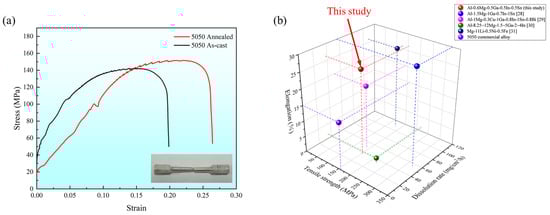 After conducting tensile testing, the stress–strain curves of the soluble Al-Mg-Ga-In-Sn alloy were obtained; representative curves were selected and are depicted in Figure 8. The as-cast Al-Mg-Ga-In-Sn alloy exhibited a tensile strength of 142.34 MPa and an elongation of 19.86%. Relatively, the annealed alloy demonstrated a higher tensile strength of 151.76 MPa along with an increased elongation of 26.43%. These results clearly indicate a significant enhancement in both tensile strength and ductility following the annealing process. The key to the design of new soluble aluminum alloys lies in their controllable dissolution performance and excellent mechanical properties under complex working conditions. The tensile strength requirement for the 5050 commercial aluminum alloy is a minimum of 160 MPa, with an elongation at break of at least 15%. In comparison, the soluble Al-Mg-Ga-In-Sn alloy in this study exhibits high ductility and overall satisfactory performance. Additionally, it possesses dissolution characteristics that are absent in 5050 commercial aluminum alloys.