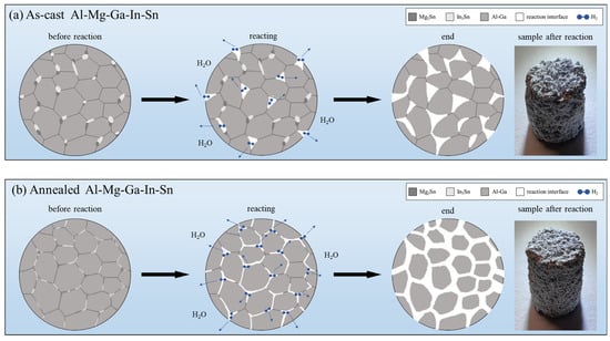 The secondary phase of the as-cast Al-Mg-Ga-In-Sn alloy is observed to be distributed in point-like and block-like discontinuous particles present at grain boundaries, as depicted in Figure 9a. It forms microcells with the Al matrix. Due to the dispersion of the secondary phase, there remains a fraction of unoccupied grain boundary area resulting in a limited number of microcells. Upon reaction, complete disconnection between adjacent grains is not achieved; instead, several or more grains combine to form larger grain units. Only when the Al–water reaction progresses significantly do these large grain units separate and detach from the overall structure.