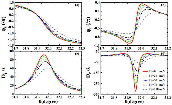 In the subsequent discussion, our focus will be on regulating the whole multi-layer structure GH shift within the field. Combined with the basic theory in the second part, when considering the quantum response of graphene, the conductivity of graphene can be dynamically controlled not only by the applied electric field but also by the applied magnetic field. This phenomenon provides a unique way to realize dynamically controllable GH shift devices. We first examine the regulatory properties of the GH shift of graphene structures in the presence of an applied electric field. Given that the effect of the applied electric field is directly reflected in the change of graphene Fermi energy, we initially explore the effect of the change in graphene Fermi energy on the phase and shift of transmission and reflection coefficients, as shown in Figure 4. It is apparent from Figure 4 that the excitation of TES leads to substantial changes in the amplitude of the transmission and reflection coefficients (see Figure 3), and also triggers drastic alterations in the transmission phase and reflected phase around the incident angle of 32°. Near 32°, where TES occurs, the transmission phase exhibits an obvious monotonically decreasing trend. This, in combination with the calculation formula of the GH shift, creates conditions that are beneficial for realizing an enhanced positive GH shift peak. On this basis, we noted that the reduction of the Fermi energy of graphene makes the transmission phase steeper near the resonance angle, leading to a significantly enhanced transmission GH. For example, when the Fermi energy is EF = 100 meV, the corresponding normalized GH shift is about 55. By lowering the Fermi energy, it is reduced to EF = 0 meV, and the corresponding normalized GH shift increases to about 95, which is almost double. A similar enhancement effect is more obvious in reflecting GH shift. Likewise, in the vicinity of 32° where TES occurs, the reflected phase demonstrates an obvious monotonically increasing trend, which, in combination with the calculation formula of the GH shift, sets the stage for the realization of an enhanced negative GH shift peak. Like the transmission case, the reduction of the Fermi energy of graphene causes the reflected phase to become steeper near the resonance angle, resulting in a more pronounced enhancement of the reflected GH shift. For example, when the Fermi energy is EF = 100 meV, the corresponding reflected normalized GH shift is about −50; when the Fermi energy is reduced to EF = 0 meV, the corresponding normalized GH shift is enhanced to about −330, representing a sixfold increase. The external electric field facilitates the dynamic manipulation of the GH shift under TES excitation, a phenomenon that is not only reflected in the amplitude but also the symbol. This provides a significant prospect for realizing flexible and dynamically controllable GH shift devices.