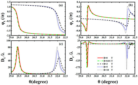 Then, we further discuss the effect of the applied magnetic field on the GH shift of the entire structure. As mentioned earlier, when considering the quantum response of graphene, the anisotropic conductivity of graphene is also reflected as a function of the applied magnetic field. This phenomenon also provides a way to realize the dynamic micro-nano devices of magnetic field control. Compared with electric field control, the direct application of the magnetic field to the exterior of the structure has advantages, especially when it comes to avoiding direct contact with the device during GH shift regulation. Without loss of generality, we also draw the change curve of transmission and reflected phase concerning the incident angle and the corresponding GH shift, as shown in Figure 5. It should be noted that to simplify the drawing, we did not draw the curve of the resonance angle changing with the angle. Generally speaking, the enhanced GH shift peak or GH shift dip correspond to the “steepest” position of the reflected phase with angle variation, and the steepest position of the reflected phase often corresponds to the position of the resonance angle. This means that changes in magnetic field intensity not only affect GH shift, but also synchronously affect resonance angle. The former is the result of the latter, while the latter is the cause that leads to the former. The effect of applied magnetic fields on GH shift differs from changes in Fermi energy, reflecting two extremes in magnetic field regulation. The figure shows that at relatively high applied magnetic fields, the regulation of the change in the magnetic field on the GH shift is significant but relatively moderate. Analysis of the transmission near the 32° where TES occurs reveals a monotonically decreasing relationship between the transmission phase and the incident angle, corresponding to a positive GH shift peak. Here, the increase in the applied magnetic field perpendicular to the graphene surface markedly steepens the transmission phase of the whole structure near the resonance angle, leading to enhanced transmission GH shift. For example, when the applied magnetic field is B = 3 T, the corresponding normalized GH shift of transmission is about 50. Increasing the applied magnetic field to B = 10 T enhances the normalized GH shift of transmission to about 85, achieving an increase of more than 60%. Similarly, the reflected phase near the 32° at which TES occurs produces a very high slope, a monotonically increasing phenomenon near the resonance angle, indicative of a large negative GH shift. The increase in the applied magnetic field intensifies the steepness of the reflection phase near the resonance angle. For example, when the magnetic field is B = 3 T, the corresponding reflected normalized GH shift is about −30; at B = 10 T, the normalized GH shift of reflection is enhanced to about −200, more than a sixfold increase. Interestingly, when it comes to a relatively low value of applied magnetic fields, the regulation of GH shift presents the opposite extreme. As can be seen from Figure 5, when the applied magnetic field decreases to B = 0.01 T or even lower, both the GH transmission peak and reflected peak demonstrate a noticeable trend of shifting to a lower angle. Although subtle changes in the external magnetic field have no significant impacts on the transmission and reflection of GH shift, the obvious “jump” changes in the GH peak remain intriguing. From a reverse perspective, this means that the structure can indirectly measure the effect of the applied magnetic field by verifying the angle at which the GH peak is located, offering an interesting approach to the environmental magnetic field in micro and nanostructures. Different from the traditional control of GH properties in the entire structure through structural and material parameters, the introduction of graphene provides a good way to dynamically manipulate GH properties using an external field.