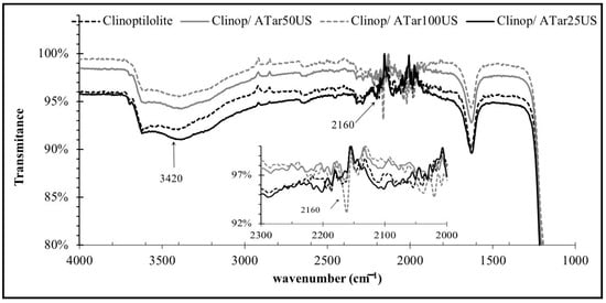 Figure 2 shows the FT-IR spectra of unmodified and modified clinoptilolite by ultrasound, Clinop/Atar25US, Clinop/Atar50US, and Clinop/Atar100US. Figure 2 presents one band in 1100 cm−1, a result of the structural units of the aluminosilicate lattice Si (Al)–O of the zeolite. All ultrasound samples show a wide band at 3420 cm−1, attributed to the O–H bond, and the Clinop/Atar50US and Clinop/Atar100US samples present a small band around 2160 cm−1, corresponding to the COOH bond, which indicates that there was a chemical modification when the functional groups were found on the surface of the clinoptilolite.